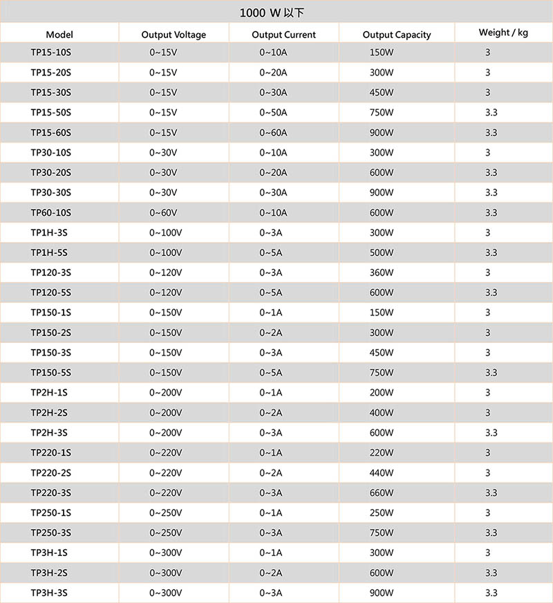 TP-S系列大功率直流電源供應器輸出功率從100W到5kW不等。 TP-S系列的輸出規格,可在功率範圍內根據使用者需求進行定制,最大輸出電壓為400V,最大輸出電流為150A。 設有OVP、OCP、OTP和OTP保護電路,可以更好的保護電源供應器機器負載。 使用者可以選配外部電壓控制、外部電流控制以及電壓回授功能。 |